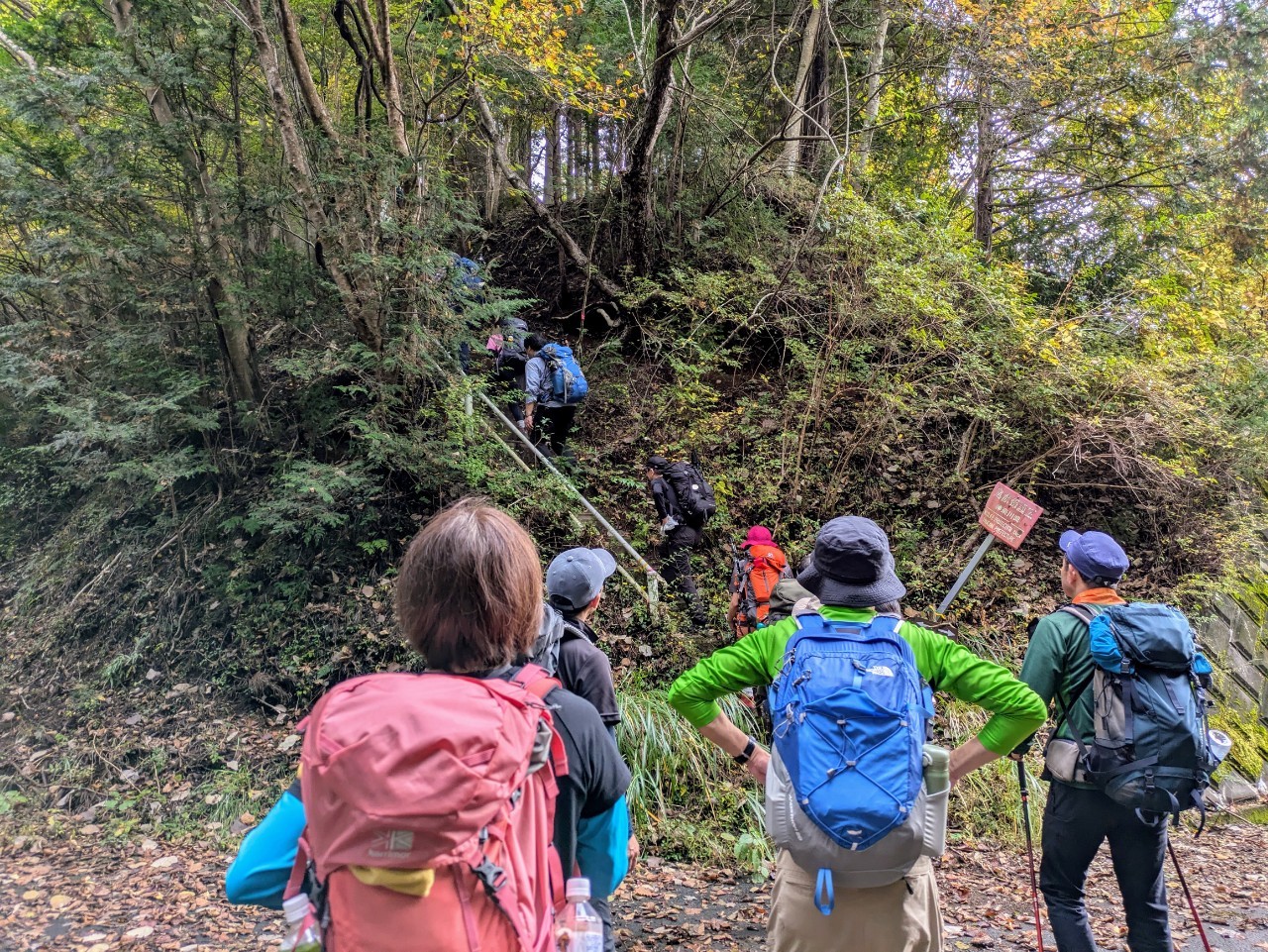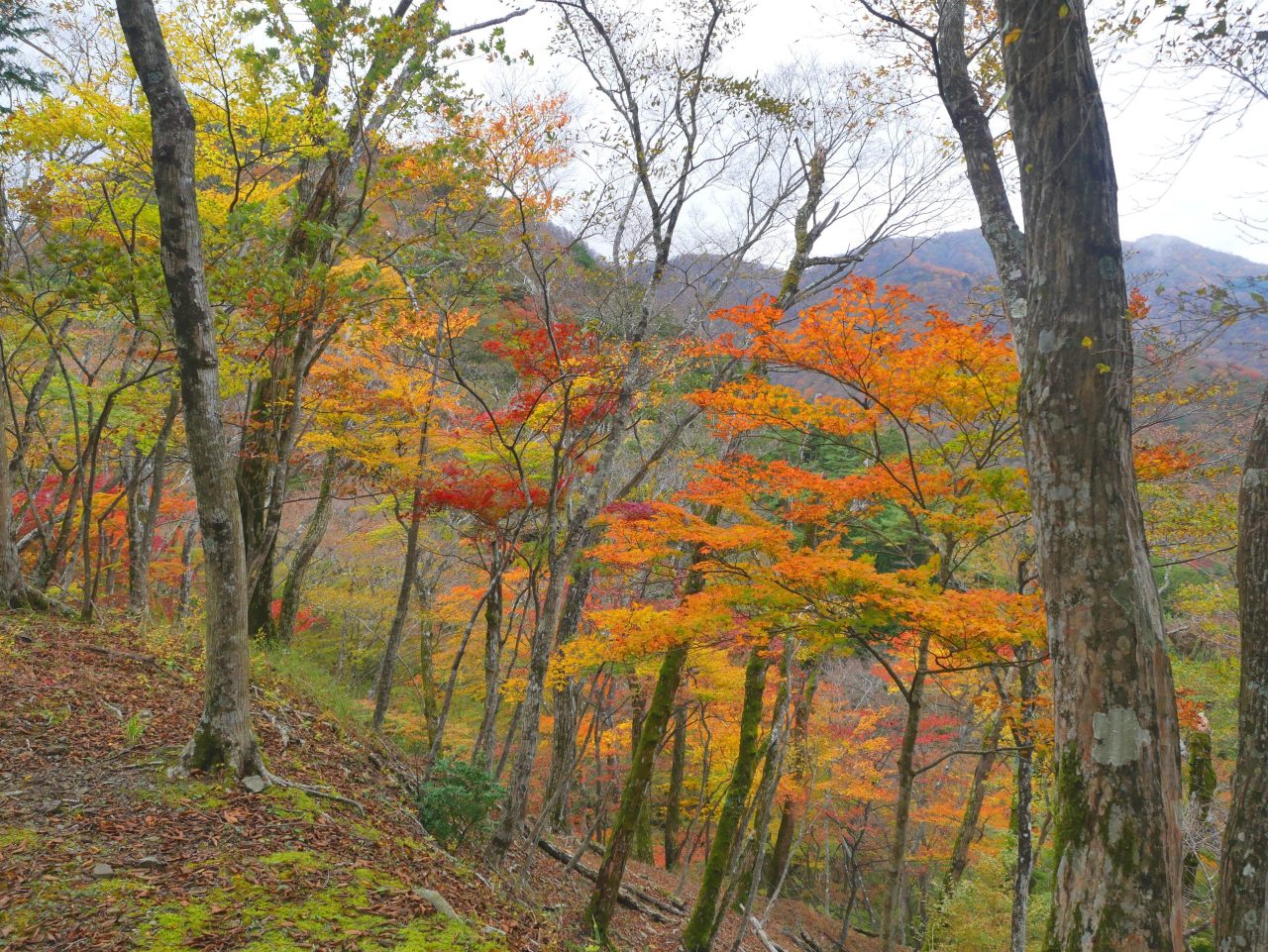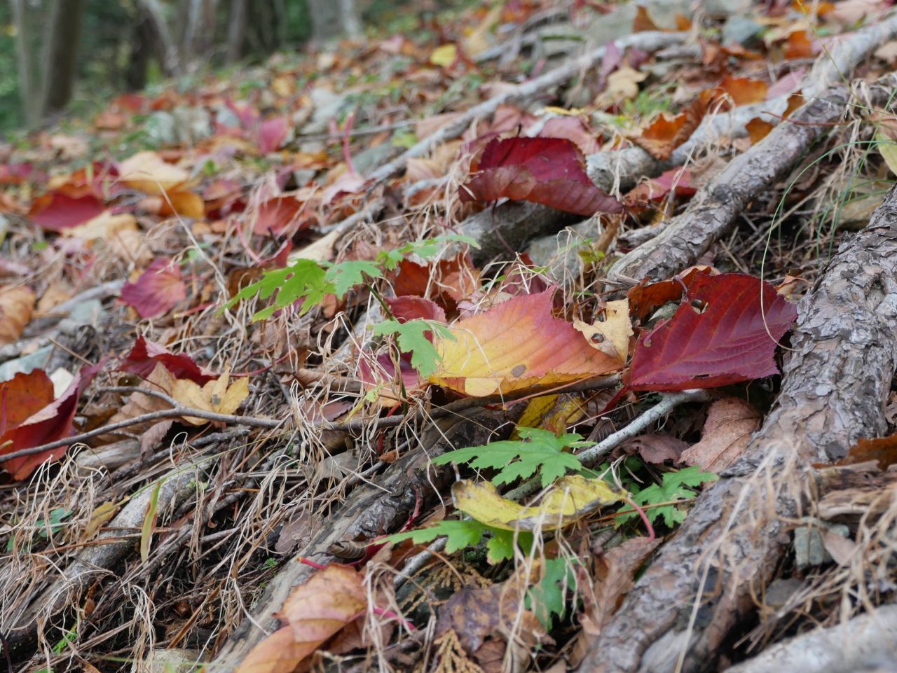 落ち葉の赤や黄色とリンドウの紫が、登山道を鮮やかに彩っています![]()
