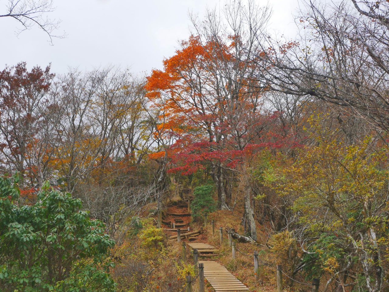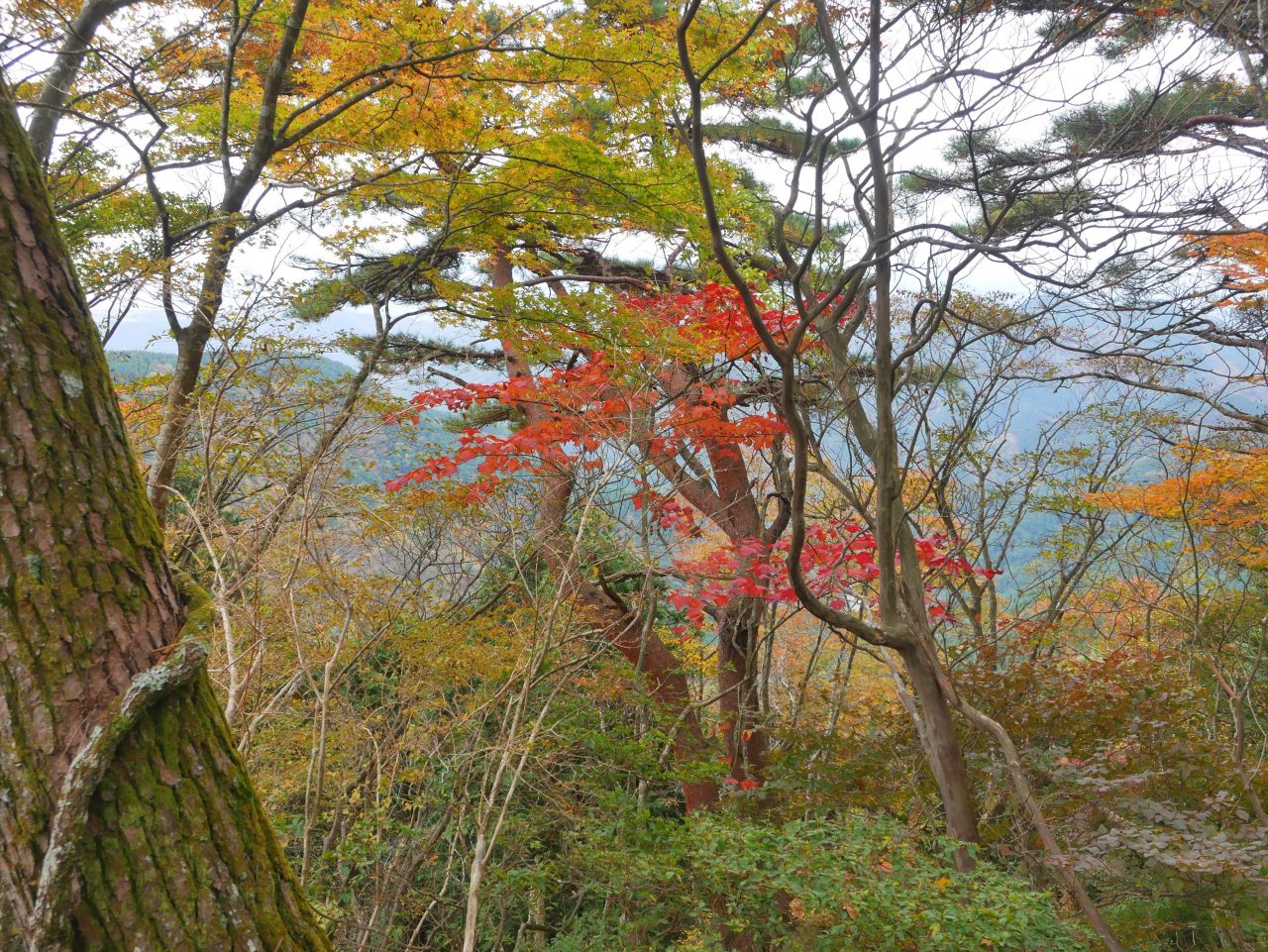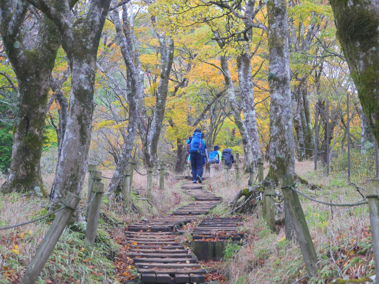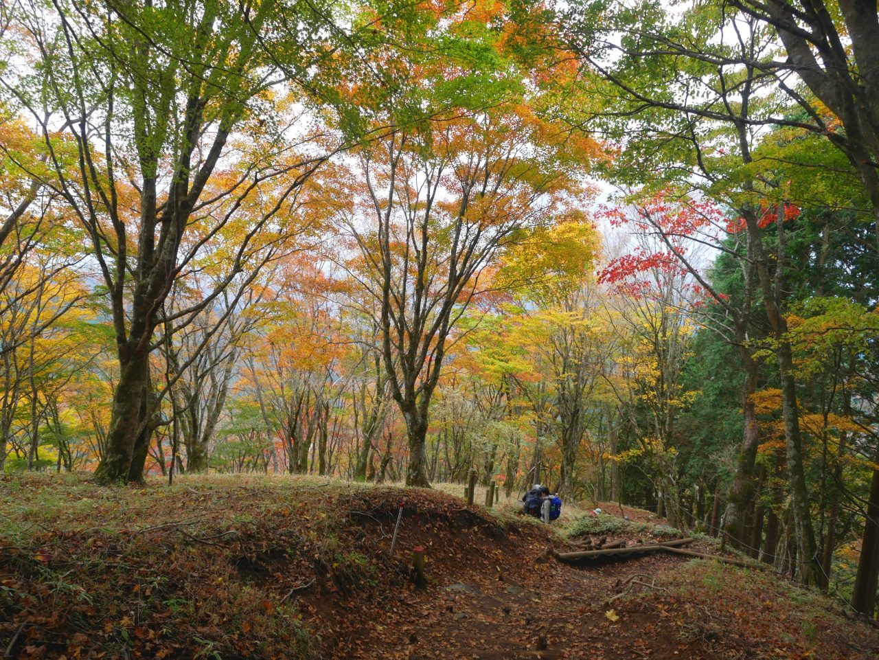 落ち葉の赤や黄色とリンドウの紫が、登山道を鮮やかに彩っています![]()