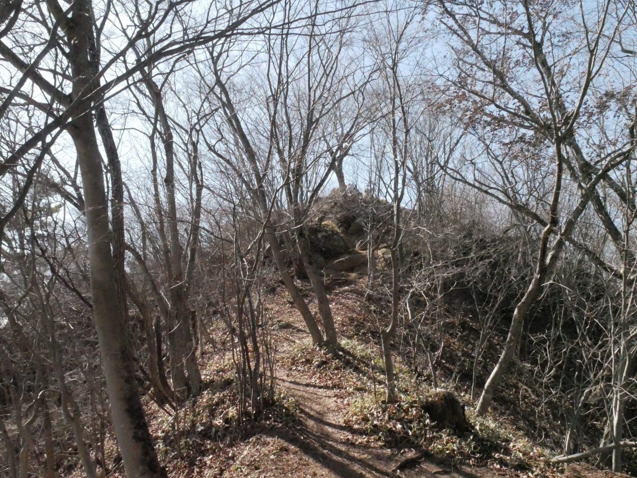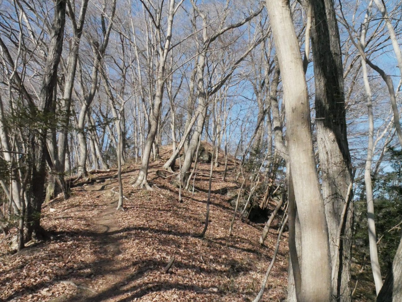 登山道の先にピークが見えるので、あそこが高川山の頂上かなって言いながら、歩いていきます。