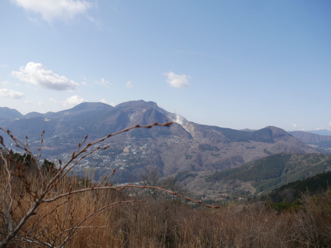 鞍部を過ぎると、明神岳に向かって、歩きます。途中、開けた場所からは、大涌谷の煙が見えます。